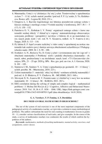 8. Панишева О. В., Еребакан И. В. Формы организации устного счета в курсе математики средней школы // Актуальные вопросы математического образования: состояние, проблемы и перспективы развития : электрон. сб. ст. по материалам всерос. науч.-практ. конф. / отв. ред. Н. В. Суханова, редкол.: А. В. Иванова [и др.]. Сургут, 2020. С. 113 - 118.