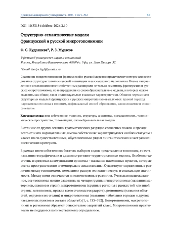 Сравнение микротопонимики французской и русской деревни представляет интерес для исследования структуры топонимической номинации и ее смыслового наполнения. Новые направления в исследовании имен собственных расширили не только семантику французских и русских микротопонимов, но и определили их словообразовательные модели, в которых можно выделить как общие, так и индивидуальные языковые характеристики. Общими чертами для структурных моделей французских и русских микротопонимов являются: прямой переход нарицательного слова в топоним, аффиксальный способ образования, словосложение и словосочетание.