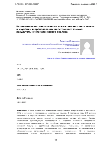 Статья посвящена применению генеративного искусственного интеллекта (ИИ) в изучении и преподавании иностранных языков. В последние годы ИИ активно внедряется в образовательный процесс, предлагая персонализированные подходы, автоматизированную оценку знаний и интерактивные методы обучения. Авторы анализируют существующие исследования и выделяют основные направления использования генеративного ИИ: чат-боты, диалоговые системы, платформы для обучения письму и адаптивные образовательные технологии. В заключение формулируются практические рекомендации для преподавателей, исследователей и образовательных организаций по интеграции генеративного ИИ в языковое образование. Работа подчеркивает важность дальнейших исследований и сотрудничества между учеными, педагогами и разработчиками технологий для эффективного использования ИИ в образовательном процессе. В качестве проблемы, особенно важной для отечественной системы образования, обозначается задача формирования этических принципов, обозначающих границы допустимого в использовании генеративного ИИ преподавателями и студентами. Методически статья выполнена в жанре систематического обзора. Критерии отбора источников включали год публикации (с 2017 по 2024 год) и тип публикаций (теоретические статьи, эмпирические исследования, обзорные статьи, технологические обзоры, редакционные мнения и дискуссионные статьи). Хотя существует значительный объем опубликованных исследований и обзоров литературы об искусственном интеллекте (ИИ) в последние годы, существующая литература, специально посвященная применению генеративного ИИ в языковом образовании, а также генеративного ИИ в целом, все еще очень ограничена. На основе проведенного обзора в статье сформулирован ряд рекомендаций. Во-первых, педагогическим работникам стоит рассмотреть возможность включения инструментов генеративного ИИ в свою педагогическую практику, оставаясь при этом бдительными и внимательными к потенциальным рискам. Непрерывное профессиональное развитие имеет решающее значение для обеспечения обоснованных решений и эффективной интеграции инструментов генеративного ИИ. Во-вторых, исследователям необходимо продолжать эмпирические исследования эффективности и влияния инструментов генеративного ИИ для развития конкретных языковых навыков и вовлечения заинтересованных сторон в ответственную интеграцию. Наконец, обществу в целом стоит учитывать, что влияние генеративного ИИ выходит за рамки языкового образования; важно рассматривать его интеграцию в другие предметные области.
