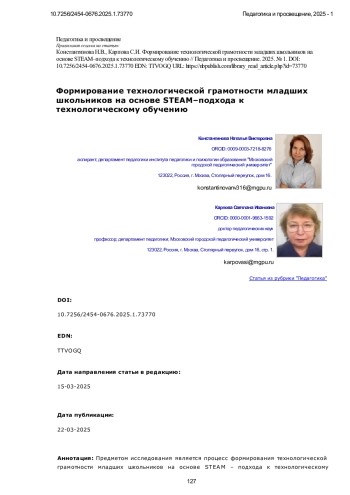 Предметом исследования является процесс формирования технологической грамотности младших школьников на основе STEAM - подхода к технологическому обучению. Объектом исследования - технологическое обучение младших школьников. Особое внимание уделяется обоснованию необходимости целенаправленного формирования у младших школьников технологической грамотности как компонента функциональной грамотности, определению его структурно-содержательных характеристик, раскрытию педагогического потенциала STEAM - подхода, объединяющего в единую систему науку (S), технологии (T), инженерию (E), искусство (A) и математику (M), к технологическому обучению как механизма формирования технологической грамотности младших школьников. Цель исследования - разработать структурно-содержательной модели формирования технологической грамотности младших школьников на основе STEAM - подхода к технологическому обучению. В качестве ведущей идеи модели выступает STEAM-подход к технологическому обучению, включающий упрощенный процесс инженерного проектирования. Методы исследования: аналитический обзор научных источников и актуальных отечественных нормативно-правовых документов в области формирования функциональной грамотности младших школьников, анализ и обобщение данных, педагогическое моделирование. Основные выводы исследования: разработана структурно-содержательная модель формирования технологической грамотности младших школьников на основе STEAM-подхода к технологическому обучению, которая: предусматривает включение компонента «технологическая грамотность» в структуру функциональной грамотности младших школьников; содержательно презентуется авторской дополнительной общеразвивающей программой по формированию технологической грамотности младших школьников на основе STEAM-подхода. Научная новизна заключается в следующем: впервые в структуру функциональной грамотности младших школьников предлагается включить технологический компонент с определением его структурно-содержательных характеристик; с учетом зарубежного опыта технологического обучения младших школьников, разработана и представлена дополнительная общеразвивающая программа технологического обучения младших школьников. Инновационным аспектом программы является формирование технологической грамотности младших школьников на основе STEAM-подхода к технологическому обучению через интеграцию в технологическом обучении знаний из других предметных областей: математики, окружающего мира, изобразительного искусства; а также на пропедевтическом уровне из физики, химии, биологии и др., реализации в технологическом обучении младших школьников упрощенного процесса инженерного проектирования, проектной и исследовательской деятельности, эдьютеймента, создание прототипов игровой среды.