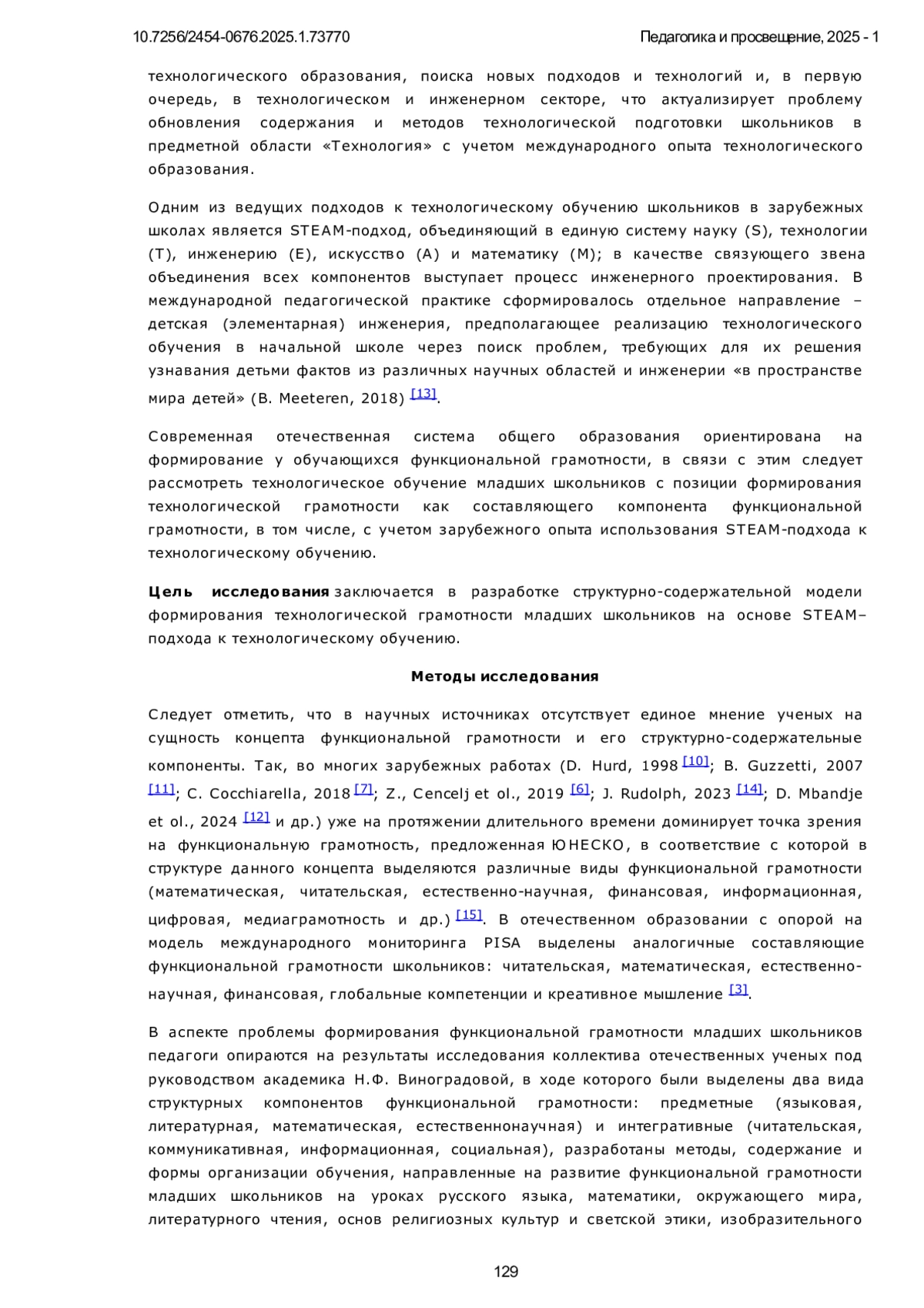1. Константинова Н.В. STEAM-подход к технологическому обучению в младшей школе: возможности и ограничения // Современная наука, актуальные вопросы науки и образования. Серия: Гуманитарные науки. 2024. № 11-2. С. 91-95.
