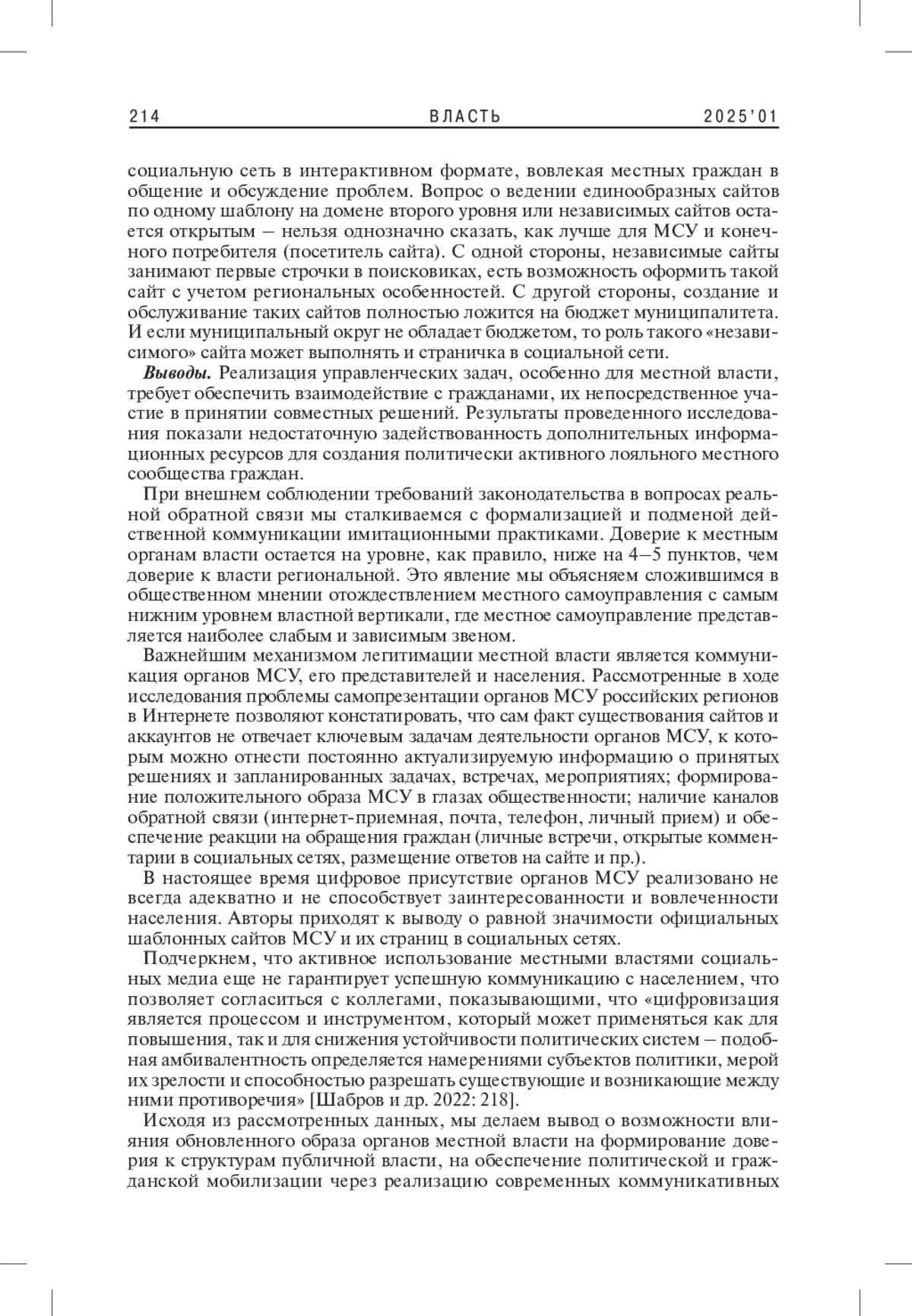1. Бардаков А.И. 2023. Местное самоуправление в политической системе современной России. - Парадигмы управления, экономики и права. № 1(7). С. 7-18. EDN: WITJDB