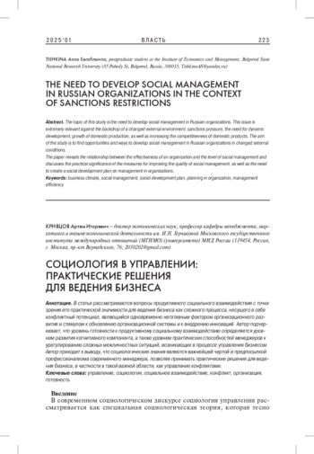 Темой данного исследования является необходимость развития социального управления в российских организациях. Данная тема является крайне актуальной на фоне изменившейся внешней среды, санкционного давления и необходимости динамичного развития и роста внутреннего производства, а также повышения конкурентоспособности отечественной продукции. Цель исследования - нахождение возможностей и путей развития социального управления в российских организациях в изменившихся внешних условиях. В статье раскрывается взаимосвязь эффективности работы организации и уровня социального управления. Автор предлагает конкретные мероприятия, способные повысить качество социального управления в организациях, а также указывает на необходимость создания плана социального развития в организации.