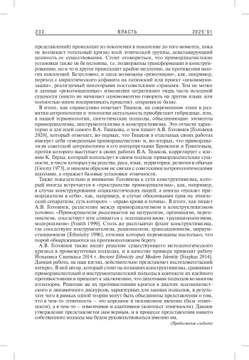 Данная статья является первой частью авторского исследования интерпретации этничности. Объектом изучения выступает этническая идентичность, которую автор рассматривает с позиции конструктивистского подхода, но с опорой на примордиалистские категории, в числе которых территория, язык, происхождение сообщества и его культура. В статье раскрывается современная научная дискуссия, посвященная столкновению примордиалистского и конструктивистского подходов, и констатируется существующий в современной антропологии запрос на создание гибридной концепции интерпретации этничности. В целом, статья представляет идейную платформу, на базе которой уже во второй части автор представляет собственный подход, в рамках которого в качестве фактора этногенеза, влияющего на групповую мобилизацию и обретение этнической группой самовосприятия этноса, а затем - этнокультурной нации, рассматриваются такие категории, как «историческая память» и «культурно-историческое наследие».