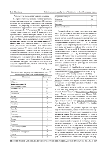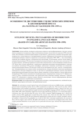 Данная работа посвящена актуальным вопросам текстоформирования в дискурсе разных типов и направлена на выявление общих тенденций реализации стилистических приемов (СП) в текстах медиа. Исследование указанной проблематики осуществлено с применением методик дискурсивно-параметрического, количественного и дистрибутивного анализа. Материалом для анализа послужила репрезентативная выборка статей из тиражных англоязычных таблоидов 1990-1999 гг., что в дальнейшем позволит рассмотреть явление в диахронической перспективе. В результате анализа сделан вывод об активности реализации СП в текстах популярной англоязычной прессы, при этом число лексических СП, по нашим данным, значительно превысило количество установленных случаев активации синтаксических СП. Также было сделано наблюдение о градуальном характере реализации лингвокреативного потенциала наиболее частотных СП (а именно метафоры, метонимии и эпитета), вследствие чего контекстуальные актуализации данныхСП в дискурсе медиа могут оцениваться как мало-, высоко- и антикреативные. Антикреативными мы считаем такие лингвокреатемы, которые обладают сниженным креативным потенциалом в дискурсе выбранного типа, но при этом их креативный потенциал может существенно возрастать при реализации в дискурсах других типов, например, в художественном. Анализ зависимости дистрибуции СП от таких показателей, как функционально-жанровый тип статьи (по Т. Г. Добросклонской) и ее объем, позволяет заключить, что наибольший объем языковых новаций, связанных с актуализацией СП, содержится в статьях-очерках (features), реализующих, помимо информирования, функцию оценки и эмоцонального воздействия на реципиента.