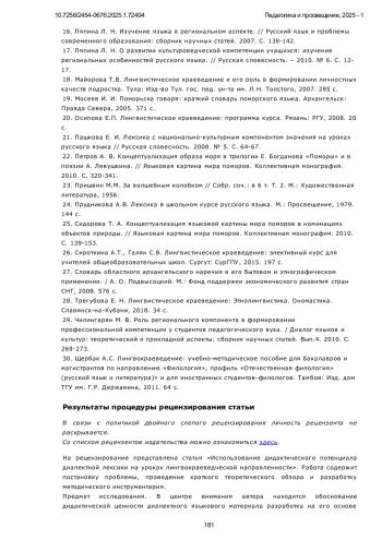 17. Ляпина Л. Н. О развитии культуроведческой компетенции учащихся: изучение региональных особенностей русского языка. // Русская словесность. - 2010. № 6. С. 12-17. EDN: MWFQOF