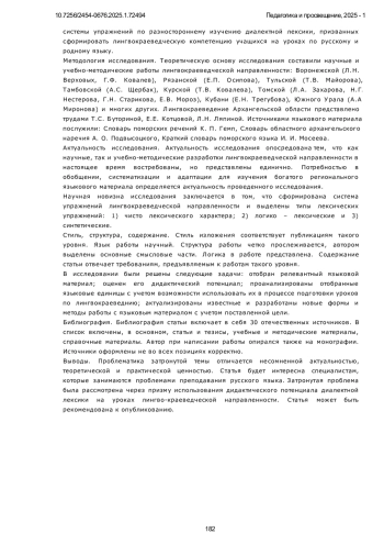 Предметом данного исследования является дидактический потенциал диалектной лексики, возможность ее использования на уроках русского языка. Диалектный языковой материале материал позволяет учащимся освоить такие языковые явления как взаимосвязь внутренней формы и лексического значения слова; системность лексики, системные связи слов. Используя диалектную лексику, мы имеем возможность демонстрировать: взаимосвязь внутренней формы и лексического значения слова, системность лексики, системные связи слов; связь между реалиями действительности, их восприятием, мышлением и языком; процессы концептуализации действительности; процессы номинации; богатство языка (диалекты - часть национального, литературно языка, их отношение); самобытность края в зеркале языка; использовать связь лексики с другими уровнями языка, в первую очередь, с морфемикой и словообразованием. При подготовке данной работы использовались следующие методы: наблюдение, классификация, моделирование, интерпретация. Основным лингвистическим методом стал структурно-семантический анализ. Многоаспектное изучение региональных особенностей в образовательных учреждениях - часть государственной образовательной политики, направленной на формирование национального патриотического самосознания учащихся. Новизна исследования заключается в актуализации диалектного материала, ранее не становившегося объектом дидактических разработок. В работе на конкретных примерах раскрывается дидактический потенциал диалектной лексики. Лингвистический анализ диалектной лексики позволяет сделать вывод о том, что использование ее на уроках лингвокраеведческой направленности позволит решить не только собственно лексикологические задачи (познакомить с понятием и значением диалекта), но и сформировать целый ряд лингвистических компетенций. Практическое применение перечисленным качествам исследуемого языкового материала находит применение в системе упражнений, представленных такими видами как чисто лексические, логико-лексические, а также синтетические.