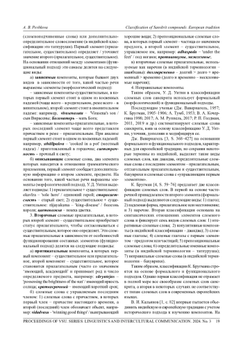 Статья посвящена рассмотрению и анализу основных видов и частных подвидов сложных слов санскрита в европейской традиции, которая представляет собой традицию грамматики слушающего. На основании этого форма и функция - это те особенности сложных слов, которые должен знать слушающий, чтобыразъязыковлять их и превращать в концепт. В европейской классификации представлены онтологический (анализ формы), гносеологический (объяснительный анализ, толкование значения) и функциональный (особенности функционирования) подходы к самасам. На основе синтаксической связи между составными элементами и особенностей функционирования выделяют копулятивные композиты (сложные слова с сочинительной связью), определительные композиты (с подчинительной связью), вторичные сложные прилагательные (притяжательные композиты, сложные слова с управляемым последним членом, вторичные сложные прилагательные, используемые как наречия) и неправильные сложные слова. Анализ и толкование значения позволяют разделить сложные слова на аддитивные (члены которых могут использоваться как самостоятельные лексические единицы с теми же значениями, что и в составе композита) и неаддитивные (идиоматичные, члены которых не могут использоваться самостоятельно и выражать то же значение, что и в составе сложного слова). Эти виды сложных слов подразделяют на частные подвиды, взяв за основу термины индийских грамматистов (татпуруша, двандва, бахувризи и аваябхава). В отечественном языкознании сложные слова классифицируются либо на основе синтаксической связи компонентов (как словосочинения) и делятся на первичные (с сочинительной и подчинительной связью) и вторичные (с соподчинительной связью), либо на основе частеречной принадлежности (как последовательности самостоятельных слов - морфологическое основание), в которой рассматриваются виды основосложения существительных, прилагательных и двандва, а также сферы их использования (функциональное основание).