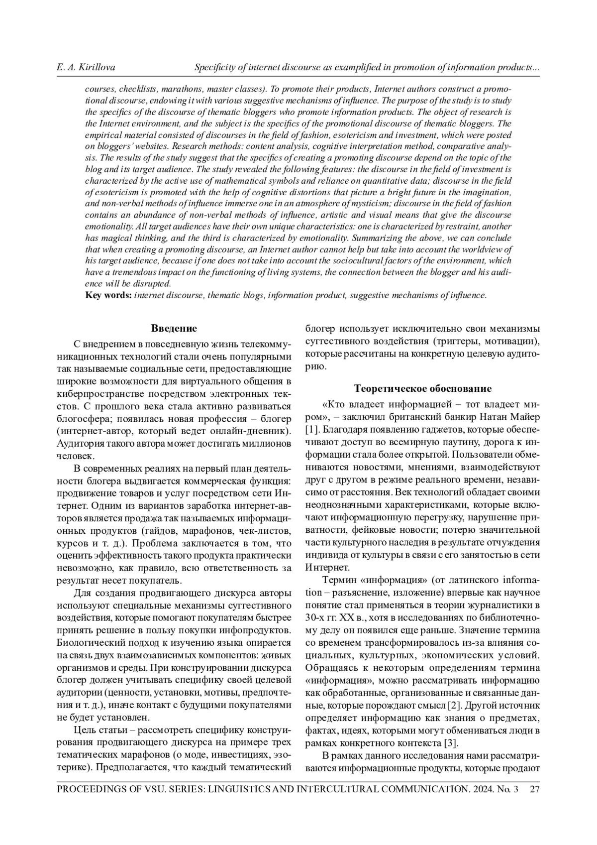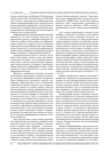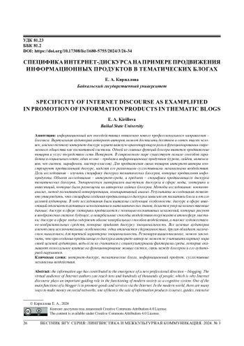 Информационный век посодействовал появлению нового профессионального направления -блогинга. Виртуальная аудитория интернет-авторов может достигать десятков и сотен тысяч человек, именно поэтому интернет-дискурс играет важную ориентирующую роль в функционировании современного общества как когнитивной системы. Одной из главных функций блогера является продвижение товаров и услуг посредством сети Интернет. В современном мире существует немало способов заработка в социальных сетях, один из них - продажа информационных продуктов (курсов, гайдов, интенсивов, чек-листов, марафонов, мастер-классов). Для продвижения своих товаров интернет-авторы конструируют продвигающий дискурс, наделяя его различными суггестивными механизмами воздействия. Цель исследования - изучить специфику дискурса тематических блогеров, которые продвигают инфопродукты. Объект исследования - интернет-среда, а предмет - специфика продвигающего дискурса тематических блогеров. Эмпирическим материалом выступили дискурсы в сфере моды, эзотерики и инвестиций, которые были размещены на авторских сайтах блогеров. Методы исследования: контент-анализ, метод когнитивной интерпретации, компаративный анализ. Результаты исследования позволяют утверждать, что специфика создания продвигающего дискурса зависит от тематики блога и от его целевой аудитории. В ходе исследования были выявлены следующие особенности: дискурс в сфере инвестиций отличается активным использованием математических знаков, делается упор на количественные данные; дискурс в сфере эзотерики продвигается с помощью когнитивных искажений, которые рисуют в воображении светлое будущее, а невербальные способы воздействия погружают в атмосферу мистики; дискурс в сфере моды содержит обилие невербальных способов воздействия, а также художественно-изобразительных средств, которые придают дискурсу эмоциональность. Все целевые аудитории имеют свои исключительные особенности: одна отличается сдержанностью, другая обладает магическим мышлением, для третьей характерна эмоциональность. Резюмируя вышеописанное, можно заключить, что при создании продвигающего дискурса интернет-автор не может не учитывать картину мира своей целевой аудитории, ведь если не считаться с социокультурными факторами среды, которые оказывают колоссальное влияние на функционирование живых систем, связь между блогером и его аудиторией нарушится.