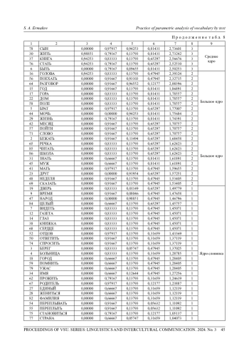 При подготовке словника к параметрическому анализу, прежде всего, необходимо создать его конкорданс – «упорядоченный список всех словоформ (или слов), с указанием их вхождений в заданный массив текстов» [4, с. 73]. Конкорданс отображает полный текст словника, и для каждой словоформы приводится контекст, который иллюстрирует ее использование, что является весьма полезным и востребованным в дальнейшей работе. Важно отметить, что количество слов в конкордансе должно строго соответствовать количеству слов в словнике. Так, во избежание потери слов при создании конкорданса нам пришлось прибегнуть к удалению всех знаков тире из текста перед его конвертацией компьютерными программами.