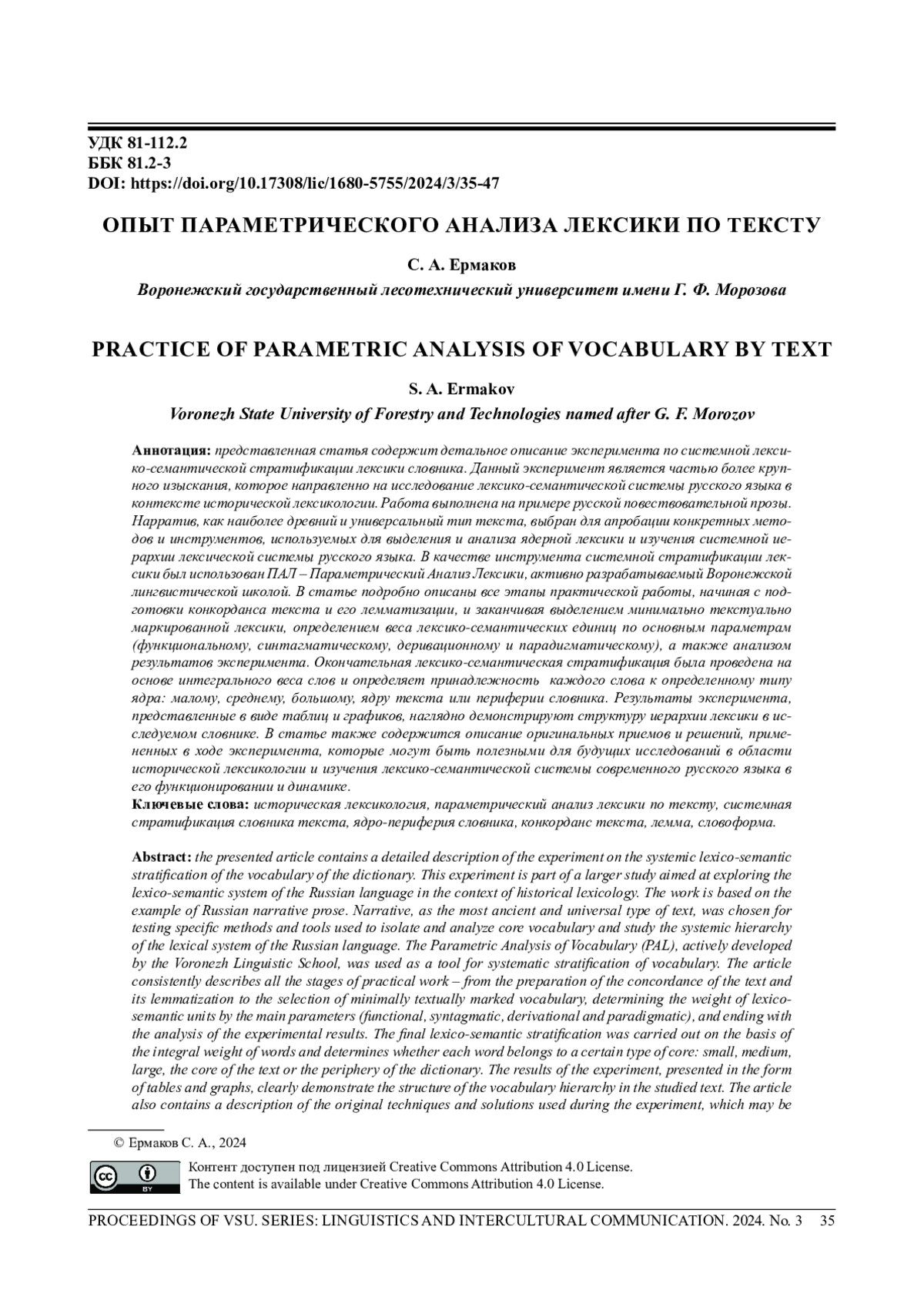 3. Кретов А. А., Ермаков С. А. Об исторической лексикологии русского языка по текстам // Вестник Воронеж. гос. ун-та. Сер.: Лингвистика и межкультурная коммуникация. 2024. № 1. С. 113-121. EDN: DITUBE