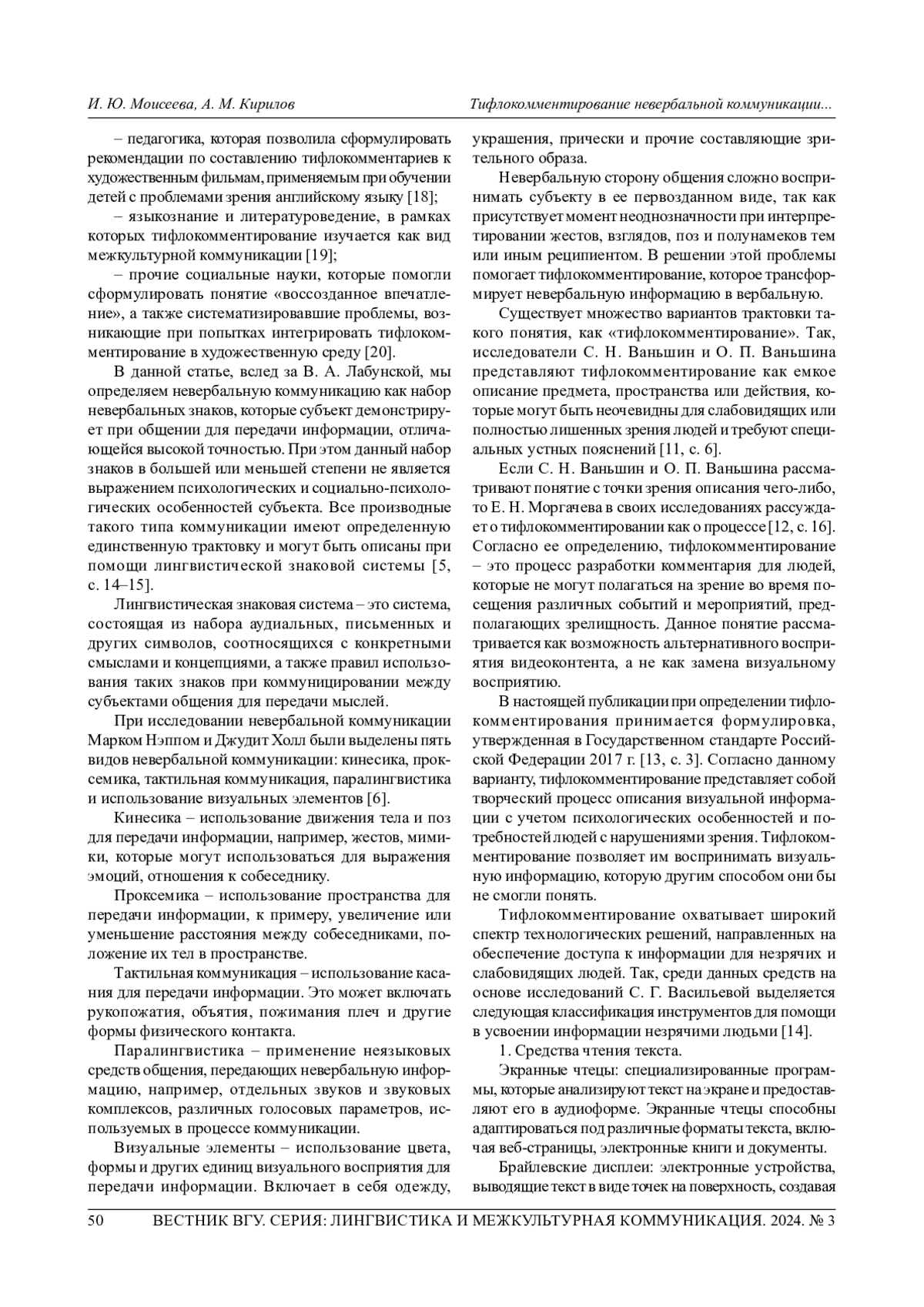 Исследование посвящено анализу невербального аспекта общения, вербализованного в виде звуковых тифлокомментариев. Материалом исследования послужил художественный фильм режиссера Леонида Гайдая «Бриллиантовая рука» с тифлокомментированием. Выбрано 85 фрагментов, в которых при помощи вербальных средств передачи информации описаны невербальные аспекты коммуникации. Работа выдержана в русле междисциплинарного, функционального и деятельностного подходов, предусматривающих системный учет стороны говорящего и слушающего, а также коммуникативные потребности говорящего и данного языкового сообщества. Авторы освещают различные подходы к изучению вопросов невербальной коммуникации и тифлокомментирования, определяют основные критерии классификаций видов невербальной коммуникации, демонстрируют виды и различные методы тифлокомментирования. В статье разработан алгоритм исследования невербального аспекта общения, вербализованного в виде звуковых тифлокомментариев, включающий следующие этапы: составление списка тифлокомментариев с соответствующими им таймкодами, упорядоченный хронологически; классификация тифлокомментариев по видам невербальной коммуникации (кинесика, проксемика, тактильная коммуникация, паралингвистика, визуальные элементы); обоснование применения тифлокомментариев в определенной ситуации невербального общения; количественный анализ использования тифлокомментирования в зависимости от вида невербальной коммуникации; анализ частей речи, вербализующих различные виды невербальной коммуникации. Анализ показал, что наиболее частотным видом невербального общения, к которому применено тифлокомментирование, является кинесика. На втором месте по частотности тифлокомментирования - проксемика и тактильная коммуникация. На третьем месте по частотности представлено тифлокомментирование визуальных элементов. Тифлокоментирование паралингвистического вида невербальной коммуникации не зарегистрировано. Авторы пришли к выводу о том, что тифлокомментирование различных видов невербальной коммуникации характеризуется использованием различных частей речи. Полученные знания могут быть применены в области межкультурной коммуникации с целью разработки эффективной стратегии грамотного взаимодействия и общения. Сведения о количественном распределении тифлокомментариев в зависимости от вида невербальной коммуникации могут использоваться для лучшей адаптации аудиовизуального произведения к перцептивным возможностям человека с нарушенным зрением.