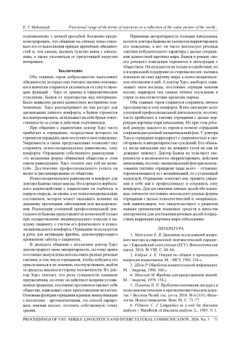 Статья отражает результаты анализа профессионально-ориентированного речевого дискурса двух языковых личностей из разных социокультурных сред, но имеющих схожее образование и профессию. Анализ был направлен на выявление интегральных и дифференциальных признаков внутри фрагментов ценностной картины мира разных стран, ценностных доминант, детерминирующих речевое поведение данных языковых личностей. Сравнительный анализ высказываний, эксплицитно или имплицитно содержащих отрицания в рамках диалогических единиц, позволил нам описать функциональный диапазон речевых тактик и стратегий, соотношение задач прагматического характера с ценностными ориентирами, которые детерминируют специфику речевого и неречевого поведения говорящего, особенности мотивационной и аксиологической систем на разных уровнях общения в рамках профессиональной иерархии. Особое внимание уделяется эмоциональному фону, сопровождающему отрицания, и сравнительному анализу психоэмоциональных реакций на всех этапах исследования речевого дискурса говорящих. Для анализируемых личностей характерен девиантный тип поведения, интересный для анализа тем, что регулярно выходит за рамки нормы, тем самым демонстрирует нетипичный функциональный диапазон языковых средств в типичных коммуникативных ситуациях. В результате анализа был обнаружен ряд общих характеристик, таких как преданность профессии, защита личного пространства, уверенность в собственной правоте. Прибегая к схожим речевым тактикам и стратегиям, доктор Быков и доктор Хаус транслируют совершенно разные ценности. Доктору Хаусу присущ в большей степени индивидуализм, его мало волнуют проблемы и эмоции других. Доктор Быков, наоборот, ощущает ответственность за всех и за все, что происходит в его отделении, для него имеет значение не только собственная рефлексия, но рецепция внешнего мира, что свидетельствует о тесной корреляции индивидуальной и национальной картин мира.