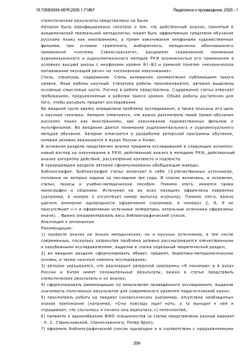 В статье представлены возможности интеграции действенного анализа, принятого в академической театральной методологии, и его главной составляющей - этюдного метода - в практику РКИ. Автор предлагает качественно новый уровень озвучивания инофонами художественных фильмов и мультфильмов, основанный на понимании природы конфликта каждой сцены, предлагаемых обстоятельств, психологии взаимоотношений персонажей, их характеров, мотивов, сверхзадачи. Обозначенные положения стали предметом исследования авторской программы «Я понимаю!», прошедшей апробацию в 6 вузах России и КНР. В статье представлены алгоритмы работы программы, а также варианты заданий и разборов на примере рассмотренного в учебнике «Я понимаю!» фильма Олега Янковского по мотивам пьесы Надежды Птушкиной «Приходи на меня посмотреть». В статье рассматриваются возможности применения основных положений «системы Станиславского» на уроках русского языка как иностранного в ходе работы со студентами-инофонами уровня В1-В2 над озвучиванием художественных фильмов и мультфильмов. За основу взято изобретение К. С. Станиславского последних лет жизни - этюдный метод, на котором базируется действенный анализ драматургического материала. Научная новизна исследования заключается в верификации гипотезы о том, что действенный анализ, принятый в академической театральной методологии, может быть эффективным средством обучения русскому языку как иностранному, а прием озвучивания инофонами художественных фильмов и мультфильмов при условии выборочного и методически обоснованного применения «системы Станиславского», расширяет современное понимание аудиовизуального и аудиолингвального методов РКИ возможностью его применения в условиях высшей школы с инофонами уровня В1-В2 и заменой понятия «механическое копирование звучащей речи» на «осознанное озвучивание». Как практический результат инофон понимает, почему эталонная речь артиста звучит именно так, как она звучит в художественном фильме; и переозвучивает персонажей не путем копирования речи носителя языка, а методом глубокого анализа драматургического и языкового материала.