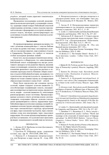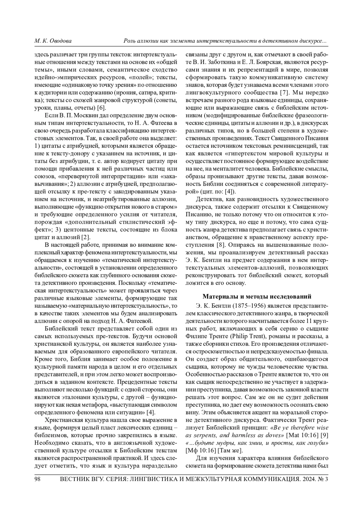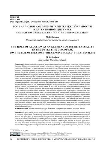Данная статья посвящена исследованию интертекстуальных элементов в детективном дискурсе. Интертекстуальность, являясь «диалогом» двух текстов, представляет собой двуплановую структуру, разделяясь на материальную и тематическую. Данные типы интертекстуальности выражаются в заимствованиях элементов плана выражения (слово или его вариант) и плана содержания текста (сюжеты, мотивы, темы, образы) соответственно. В работе мы обращаемся к изучению тематической интертекстуальности для установления библейского сюжета, являющегося основанием детективного рассказа. Для достижения поставленной задачи анализируется аллюзия, которая, будучи одним из показателей материальной интертекстуальности, представляет собой скрытый тип заимствования элементов, по которым реципиент узнает исходный текст. В исследовании делается акцент на выявление библейских аллюзий, поскольку Библейский текст является самым используемым претекстом в европейской культуре, и сам детективный дискурс, содержа отсылки к Священному Писанию, предполагает связь с христианскими ценностями. В качестве источника материала выступает рассказ Э. К. Бентли «The Genuine Tabard». Анализ рассказа построен по алгоритму, состоящему из четырех шагов: определение библейского сюжета; сопоставление характерных черт героев; установление языковых средств, подтверждающих связь с исходным текстом; установление неатрибутированных аллюзий. Выявленные аллюзии имеют разную степень имплицитности: легко декодируемые, выраженные через библейские фразеологические единицы, и трудно декодируемые (неатрибутированные), проявляющиеся через изменение части речи, синонимичные конструкции и слова, смысловую корреляцию и синтаксическую структуру предложений, дешифровка которых требует от читателя определенного культурного фонового знания. В ходе анализа были установлены два основных типа аллюзий: способствующие трансформации библейского сюжета, и аллюзии, позволяющие реконструировать библейский сюжет в детективном дискурсе.