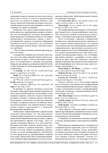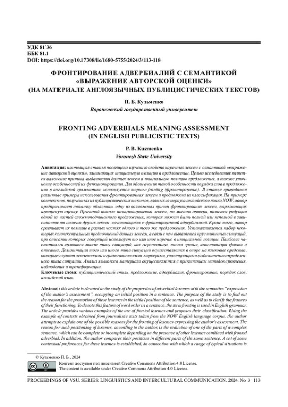 Настоящая статья посвящена изучению свойств наречных лексем с семантикой «выражение авторской оценки», занимающих инициальную позицию в предложении. Целью исследования является выяснение причины выдвижения данных лексем в инициальную позицию предложения, а также уточнение особенностей их функционирования. Для обозначения такой особенности порядка слов в предложении в английской грамматике используется термин fronting (фронтирование). В статье приводятся различные примеры использования фронтированных лексем и предложена их классификация. На примере контекстов, полученных из публицистических текстов, взятых из корпуса английского языка NOW, автор предпринимает попытку объяснить одну из возможных причин фронтирования лексем, выражающих авторскую оценку. Причиной такого позиционирования лексем, по мнению автора, является редукция одной из частей сложноподчиненного предложения, которая может быть полной или неполной в зависимости от наличия других лексем, сочетающихся с фронтированной адвербиалией. Кроме того, автор сравнивает их позиции в разных частях одного и того же предложения. Устанавливается набор некоторых контекстуальных предпочтений данных лексем, в связи с чем выявляется круг типичных ситуаций, при описании которых говорящий использует то или иное наречие в инициальной позиции. Наиболее частотными являются такие типы ситуаций, как перспектива, точка зрения, констатация факта и описание. Делимитация того или иного типа ситуации осуществляется в опоре на языковые средства, которые служат лексическими и грамматическими маркерами, участвующими в обозначении определенного типа ситуации. Анализ языкового материала осуществляется с привлечением методов сравнения, наблюдения и трансформации.