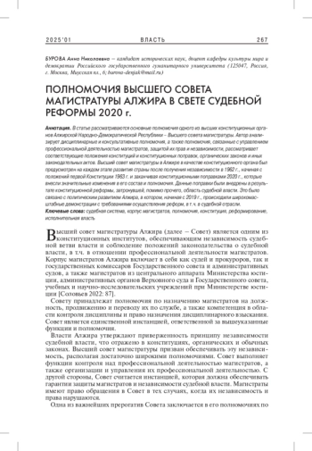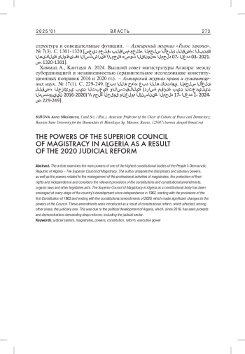 1. Соловьев А.А. 2022. Основные полномочия Высшего совета магистратуры Алжирской Народной Демократической Республики. - Вестник Арбитражного суда Московского округа. № 1. С. 86-93. DOI: 10.46279/ASMO.2022.21.93.0