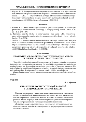 1. Кудрань В. А. Специфика развития творческих способностей подростков в условиях применения информационных технологий // Педагогический журнал. 2019. Т. 9. № 1-1. С. 290 - 298.
