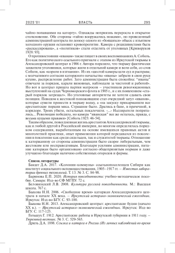 5. Быкова Н.Н. 2013. Александровский централ: арестантские будни (начало ХХ в.). - Иркутский историко-экономический ежегодник. Иркутск: Изд-во БГУ. С. 117-125. EDN: RAOJNB