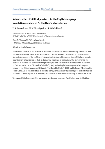 Статья посвящена проблеме воссоздания в художественном переводе библейских претекстов. Актуальность темы определяется необходимостью исследования англоязычных переводов рассказов А. П. Чехова в аспекте рассмотрения интертекстуальных вкраплений из библейских претекстов с целью изучения актуализации их метафорических смыслов в процессе перевода. Научная новизна статьи определяется тем, что в ней предпринята попытка анализа в сравнительно-сопоставительном аспекте содержащих библейские претексты языковых единиц, представленных в оригинале рассказа А. П. Чехова «Скрипка Ротшильда» (1894), а также их соответствий, фигурирующих в вариантах перевода рассказа на английский язык, осуществленных британскими переводчиками К. Гарнетт (“Rothschild’s Fiddle”, 1920) и Дж. Леджером (“Rothschild’s Violin”, 2014). Выявлено, что для передачи в переводе смыслов подобных интер- текстуальных включений художественного текста в ряде случаев необходимо использование переводческого комментария, либо переводческих примечаний.
