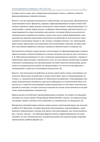 В статье дается краткий анализ понятию «вирус разума» и его функционированию в современном информационном поле. Указывается, что практически во всех работах, в которых в той или иной степени затрагивается проблема вируса разума, она рассматривается в контексте влияния на сознание человека или массы людей. Констатируется, что применение определенных вербальных единиц, а также их структурирование в необходимом порядке может привести к практически аналогичному эффекту воздействия на объект, как и при биологическом или компьютерном вирусе, т. е. к психологическому стрессу, искажению реальности, сбою информации, негативным эмоциям и т. д.