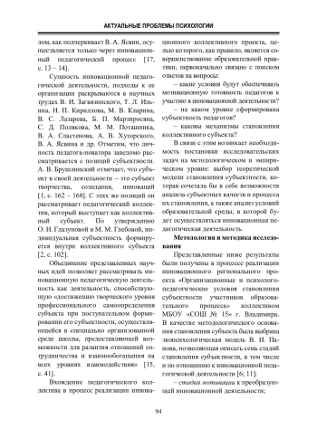 Статья раскрывает результаты исследования структуры психологических характеристик субъектности педагогов, включенных в реализацию регионального инновационного проекта (N = 40). В исследуемую структуру вошли способы реализации педагогической деятельности, соответствующие высоким стадиям субъектности «эксперт», «мастер» и «творец» в соответствии с экопсихологической моделью субъектности; характеристики образовательной среды: когерентность, доминантность, обобщенность, активность; параметры креативности; склонность к принятию сложных задач; настойчивость в достижении цели; мотивация к совершенствованию рутинных способов педагогической деятельности.