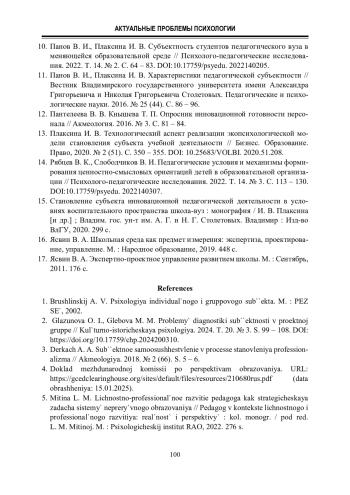 10. Панов В. И., Плаксина И. В. Субъектность студентов педагогического вуза в меняющейся образовательной среде // Психолого-педагогические исследования. 2022. Т. 14. № 2. С. 64 - 83. https://doi.org/10.17759/psyedu.2022140205.