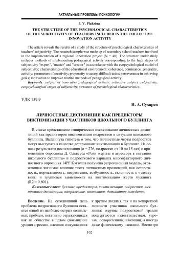 В статье представлено эмпирическое исследование личностных диспозиций как предикторов виктимизации подростков в ситуации школьного буллинга. Выдвинута гипотеза о том, что личностные черты подростков могут выступать в качестве детерминант виктимизации в буллинге. На основе результатов исследования (n = 276, подростки от 10 до 15 лет) с применением опросника Д. Ольвеуса «Роли жертвы и агрессора в ситуации школьного буллинга» и подросткового варианта многофакторного личностного опросника 14PF Кэттелла получена регрессионная модель, отражающая значимое влияние таких личностных проявлений, как осторожность, нормативность, неврастения, возбудимость, склонность к чувству вины и групповая зависимость на виктимизацию жертв буллинга (R2 = 0,801).