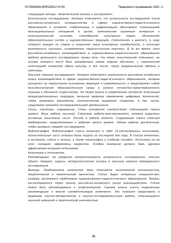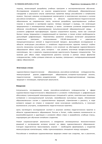 Статья посвящена анализу российско-китайского сотрудничества в сфере художественно-педагогического образования в условиях современной глобализации и ускоренной цифровизации. Исследуются ключевые исторические, культурные и педагогические аспекты взаимодействия двух крупнейших стран, включая влияние классической советской системы образования на китайскую художественную школу, также актуальные современные тенденции, такие как интеграция цифровых технологий и искусственного интеллекта, междисциплинарные подходы и кросс-культурные исследования, академические обмены и стажировки. Особое внимание уделено детальному сравнительному анализу педагогических практик России и Китая, системному выявлению их сильных сторон и конкретным возможностям для взаимного обогащения. Авторы рассматривают, как традиционные методы обучения органично сочетаются с инновационными подходами, также как культурные различия непосредственно влияют на формирование современных образовательных стратегий. В работе методы историко-культурного анализа, сравнительной педагогики, а также практико-ориентированный подход, включающий разработку учебных программ и экспериментальное обучение. Исследование опирается на анализ академических публикаций, образовательных стандартов и реального опыта совместных проектов между российскими и китайскими вузами. Научная новизна исследования заключается в комплексном изучении и анлизе российско-китайского сотрудничества в области художественно-педагогическом образовании на современном этапе, включая разработку адаптированных учебных планов и программ и критериев оценки. Авторы приходят к выводу, что интеграция традиционных и инновационных методов, а также системное усиление академических обменов способствуют формированию мультикультурной образовательной среды в условиях цифровой трансформации. Однако сохраняются вызовы, такие как сложный баланс между традициями и модернизацией на практике, а также острая необходимость дальнейшей цифровизации. Перспективы развития очевидно включают расширение совместных программ, использование VR/AR-технологий и укрепление междисциплинарных связей в педагогический процесс. Дальнейшие исследования в области интеграции российских и китайских педагогических практик помогут глубже изучить механизмы культурного обмена и его влияния на обогащение художественного образования обеих стран, цель которого - как развить значимые профессиональные компетенции, так и укрепить социокультурную идентичность будущих специалистов. Тем важнее для обеих стран продолжение диалога культур в рамках новых форматов сотрудничества, чтобы успешно отвечать на вызовы, связанные с интернационализацией сферы образования.