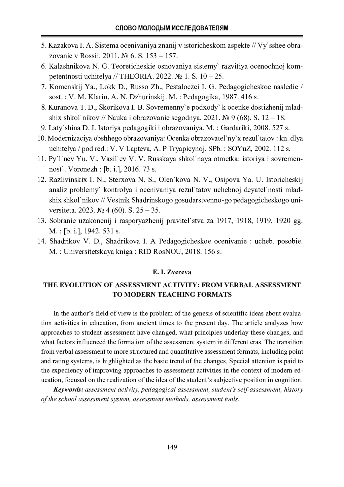 12. Разливинских И. Н., Стерхова Н. С., Оленькова Н. В., Осипова Я. У. Исторический анализ проблемы контроля и оценивания результатов учебной деятельности младших школьников // Вестник Шадринского государственного педагогического университета. 2023. № 4 (60). С. 25 - 35.