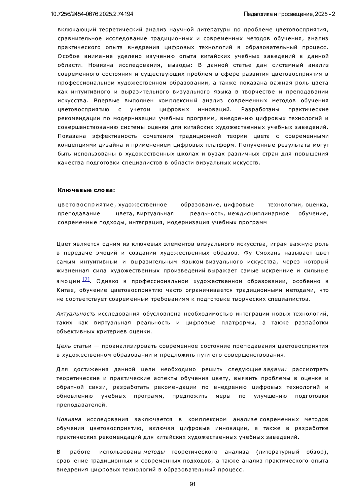 Цвет является одним из ключевых элементов визуального искусства, играя важную роль в передаче эмоций и создании художественных образов. Предметом исследования: Современные подходы к развитию цветовосприятия в профессиональном художественном образовании, включая интеграцию цифровых технологий и совершенствование методик обучения. Актуальность исследования обусловлена необходимостью интеграции новых технологий, таких как виртуальная реальность и цифровые платформы, а также разработки объективных критериев оценки. Цель статьи - проанализировать современное состояние преподавания цветовосприятия в художественном образовании и предложить пути его совершенствования. Для достижения данной цели необходимо решить следующие задачи: рассмотреть теоретические и практические аспекты обучения цвету, выявить проблемы в оценке и обратной связи, разработать рекомендации по внедрению цифровых технологий и обновлению учебных программ, предложить меры по улучшению подготовки преподавателей. Методология исследования: Использован комплексный подход, включающий теоретический анализ научной литературы по проблеме цветовосприятия, сравнительное исследование традиционных и современных методов обучения, анализ практического опыта внедрения цифровых технологий в образовательный процесс. Особое внимание уделено изучению опыта китайских учебных заведений в данной области. Новизна исследования, выводы: В данной статье дан системный анализ современного состояния и существующих проблем в сфере развития цветовосприятия в профессиональном художественном образовании, а также показана важная роль цвета как интуитивного и выразительного визуального языка в творчестве и преподавании искусства. Впервые выполнен комплексный анализ современных методов обучения цветовосприятию с учетом цифровых инноваций. Разработаны практические рекомендации по модернизации учебных программ, внедрению цифровых технологий и совершенствованию системы оценки для китайских художественных учебных заведений. Показана эффективность сочетания традиционной теории цвета с современными концепциями дизайна и применением цифровых платформ. Полученные результаты могут быть использованы в художественных школах и вузах различных стран для повышения качества подготовки специалистов в области визуальных искусств.