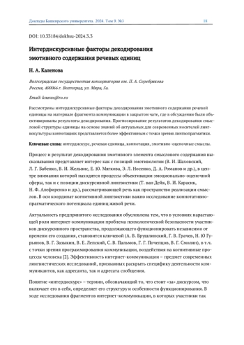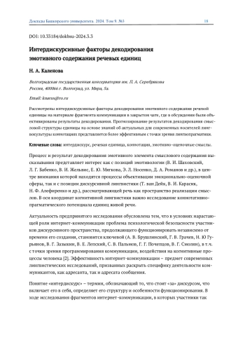 Рассмотрены интердискурсивные факторы декодирования эмотивного содержания речевой единицы на материале фрагмента коммуникации в закрытом чате, где в обсуждении были объективированы результаты декодирования. Прогнозирование результатов декодирования смысловой структуры единицы на основе знаний об актуальных для современных носителей лингвокультуры коннотациях представляется более эффективным с точки зрения лингвопрагматики.
