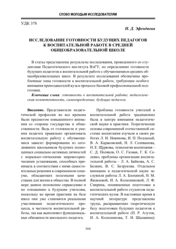 В статье представлены результаты исследования, проведенного со студентами Педагогического института ВлГУ, по определению готовности будущих педагогов к воспитательной работе с обучающимися средних общеобразовательных школ. В результате исследования обозначены проблемные зоны готовности к воспитательной работе, требующие особого внимания преподавателей вуза в процессе базовой профессиональной подготовки.