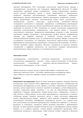 Предметом настоящего исследования выступает лингводидактика ИИ в аспекте его языковой репрезентации в соответствии с когнитивной моделью человеческого языкового мышления. Статья посвящена интеграции технологий искусственного интеллекта (ИИ) в процессе преподавания русского языка как иностранного (РКИ) студентам бакалавриата Хэйлунцзянского университета, Института русского языка. Автор анализирует преимущества и вызовы применения AI-инструментов, таких как чат-боты, в формировании коммуникативных компетенций, а также предлагает методические рекомендации по оптимизации учебного процесса в условиях цифровой трансформации. На основе анализа кейсов использования ИИ (включая чат-бот «Алиса») обоснована программа применения AI-инструментов в практике преподавания РКИ, сочетающая классические педагогические подходы с инновационными технологиями для повышения эффективности обучения. В работе применялись следующие методы исследования: - методы теоретического познания: анализ научной литературы; анализ и синтез теоретического и эмпирического материала; вероятное прогнозирование, позволившие обосновать особенности формирования лексико-грамматических навыков обучающихся посредством чат-бота;- методы эмпирического познания: лингвистический анализ текста, описательный и переводческий анализы, кейс-стади; педагогический эксперимент. Новизна исследования заключается в следующем: разработаны и апробированы рекомендации по формированию иноязычных лексико-грамматических навыков при обучении письму и говорению на занятиях по РКИ, основанные на синтезе классических дидактических принципов (коммуникативная направленность, учёт родного языка) и технологий искусственного интеллекта. Методические рекомендации включают в себя: алгоритмы адаптивного подбора упражнений с использованием чат-бота «Алиса»; интерактивные сценарии для отработки синонимии и падежной системы русского языка; автоматизированную обратную связь по грамматическим ошибкам. Выводы. В результате исследования установлено, что интеграция классических педагогических подходов к формированию коммуникативных компетенций с технологиями ИИ (например, чат-ботом с Алисой) позволяет создать программу обучения, основанную на развитии языковых способностей и цифровой грамотности, что значительно повышает межкультурные коммуникативные навыки студентов и их инновационное мышление.