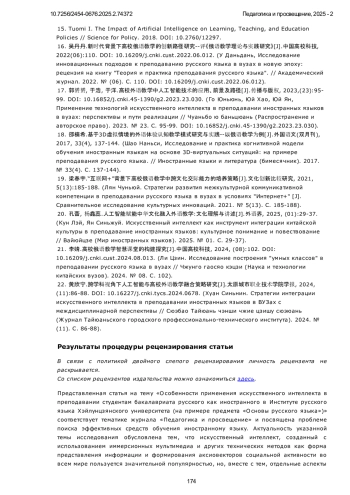 22. 黄欣宁.跨学科视角下人工智能与高校外语教学融合策略研究[J].太原城市职业技术学院学报, 2024, (11):86-88. 10.16227/j.cnki.tycs.2024.0678. (Хуан Синьнин. Стратегии интеграции искусственного интеллекта в преподавании иностранных языков в ВУЗах с междисциплинарной перспективы // Сюэбао Тайюань чэнши чжие цзишу сюэюань (Журнал Тайюаньского городского профессионально-технического института). 2024. № (11). С. 86-88).