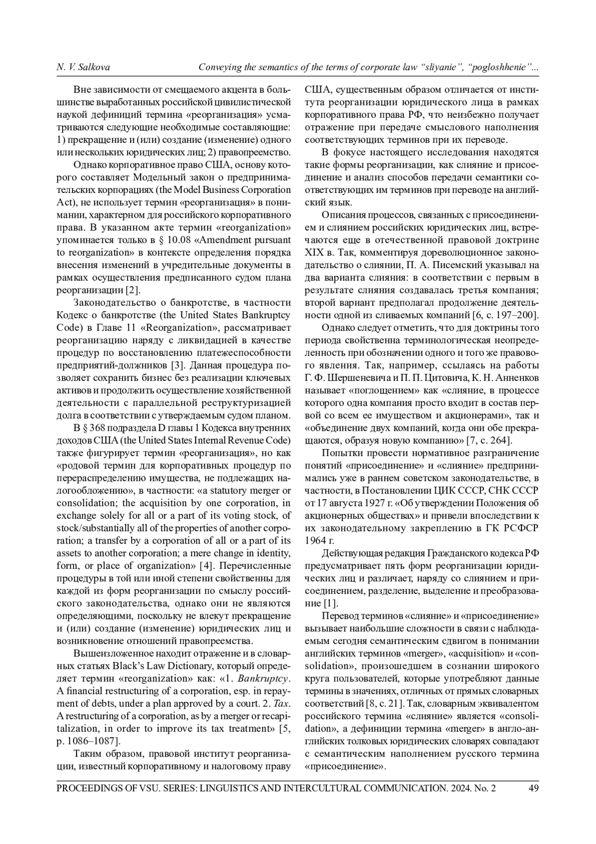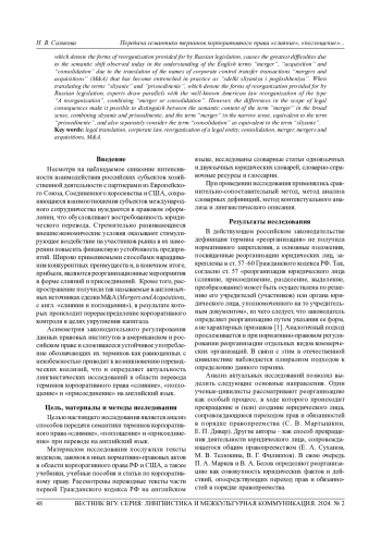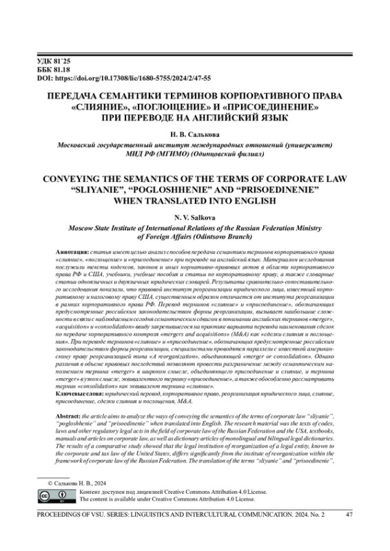 Статья имеет целью анализ способов передачи семантики терминов корпоративного права «слияние», «поглощение» и «присоединение» при переводе на английский язык. Материалом исследования послужили тексты кодексов, законов и иных нормативно-правовых актов в области корпоративного права РФ и США, учебники, учебные пособия и статьи по корпоративному праву, а также словарные статьи одноязычных и двуязычных юридических словарей. Результаты сравнительно-сопоставительного исследования показали, что правовой институт реорганизации юридического лица, известный корпоративному и налоговому праву США, существенным образом отличается от института реорганизации в рамках корпоративного права РФ. Перевод терминов «слияние» и «присоединение», обозначающих предусмотренные российским законодательством формы реорганизации, вызывает наибольшие сложности в связи с наблюдаемым сегодня семантическим сдвигом в понимании английских терминов «merger», «acquisition» и «consolidation» ввиду закрепившегося на практике варианта перевода наименования сделок по передаче корпоративного контроля «mergers and acquisitions» (M&A) как «сделки слияния и поглощения». При переводе терминов «слияние» и «присоединение», обозначающих предусмотренные российским законодательством формы реорганизации, специалистами проводятся параллели с известной американскому праву реорганизацией типа «A reorganization», объединяющей «merger or consolidation». Однако различия в объеме правовых последствий позволяют провести разграничение между семантическим наполнением термина «merger» в широком смысле, объединяющего присоединение и слияние, и термина «merger» в узком смысле, эквивалентного термину «присоединение», а также обособленно рассматривать термин «consolidation» как эквивалент термина «слияние».