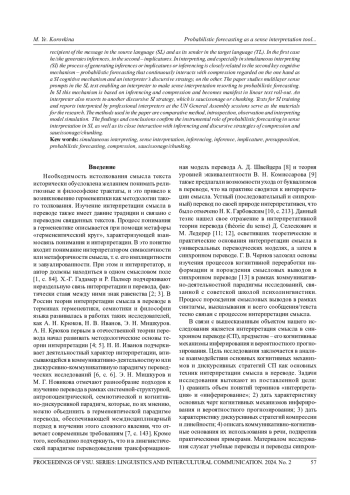 Предмет данного исследования - особенности использования когнитивных механизмов и дискурсивных стратегий при интерпретации и репрезентации переводчиком смысла в устном переводе. Кроме обсуждения новых терминов, характеризующих процесс интерпретации смысла в рамках когнитивно-коммуникативной теории, цель исследования сводится к анализу взаимодействия инферирования и вероятностного прогнозирования как основных техник интерпретации смысла в синхронном переводе. Инферирование представляет собой универсальный когнитивный механизм, заключающийся в извлечении и генерировании смысловых выводов на основе пресуппозиционного знания, входящего в тезаурус переводчика или почерпнутого из информационных источников в случае лакун в тезаурусных знаниях. В зависимости от того, в какой роли выступает переводчик - получателя или отправителя сообщения, мы подразделяем смысловые выводы на инференции и импликации. В устном, и особенно синхронном переводе (СП), процесс извлечения и генерирования смысловых выводов тесно связан с вероятностным прогнозированием, в свою очередь постоянно взаимодействующим с компрессией, которая может рассматриваться в качестве когнитивной составляющей СП и дискурсивной стратегии переводчика. Проблема, рассматриваемая в исследовании, - анализ многослойных смысловых опор текста исходного языка (ИЯ), позволяющих переводчику интерпретировать смысл, прибегая к вероятностному прогнозированию. В СП данный механизм основывается на инферировании и компрессии и проявляется при линейном развертывании текста во времени. При этом переводчик также часто прибегает к еще одной дискурсивной стратегии - линейности (saucissonage/chunking) или упреждающей сегментации. В качестве материала были взяты учебные переводы и переводы материалов отчетов о заседаниях ГА ООН. Методология исследования - сравнение, сопоставление, интроспекция, наблюдение и переводческое моделирование. Выводы подтверждают инструментальную роль вероятностного прогнозирования в интерпретации смысла в СП, а также его тесное взаимодействие с инферированием и дискурсивными стратегиями компрессии и линейности.