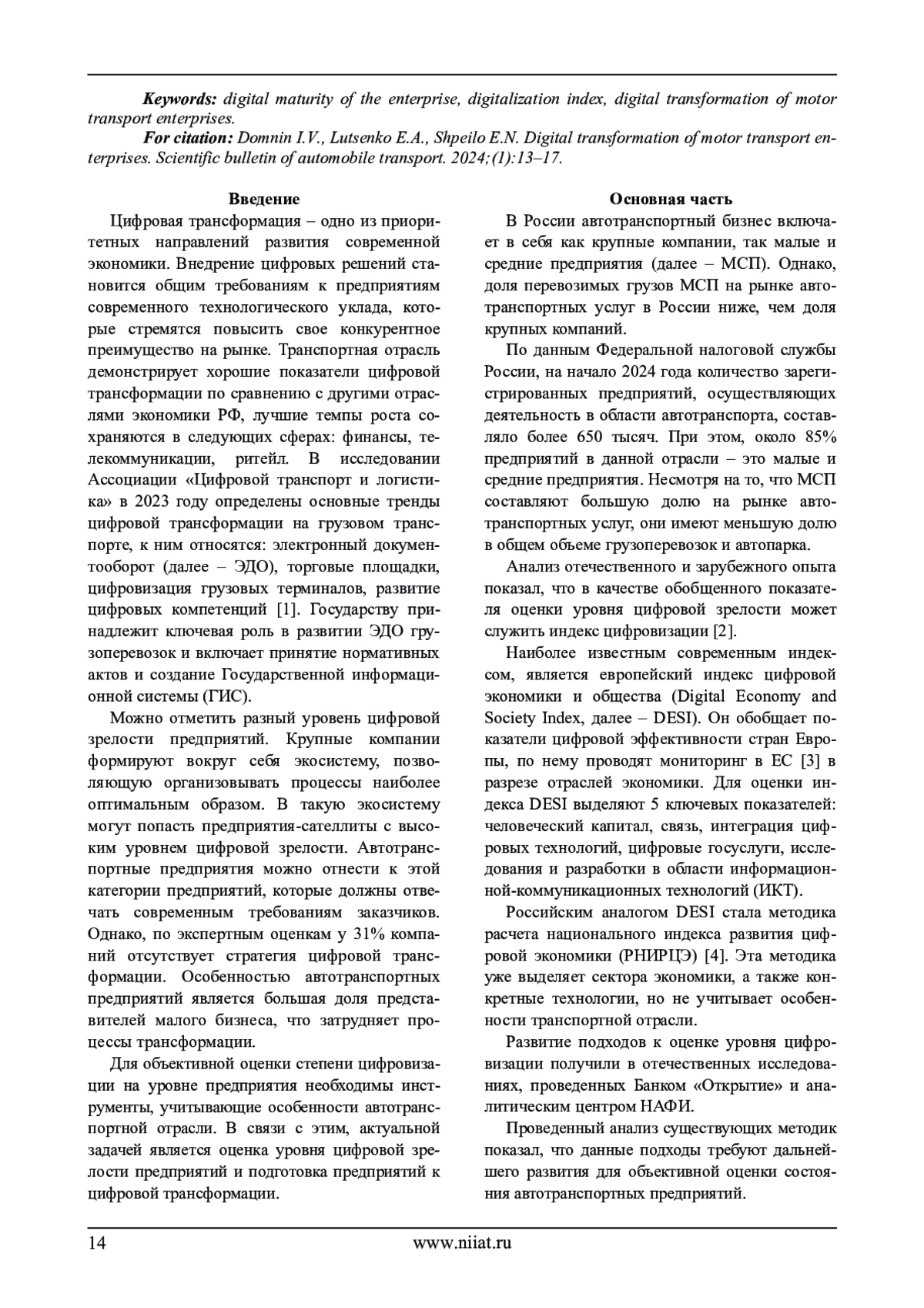 ДОМНИН И. В., ЛУЦЕНКО Е. А., ШПЕЙЛО Е. Н. ЦИФРОВАЯ ТРАНСФОРМАЦИЯ АВТОТРАНСПОРТНЫХ ПРЕДПРИЯТИЙ // НАУЧНЫЙ ВЕСТНИК АВТОМОБИЛЬНОГО ТРАНСПОРТА. 2024. № 1