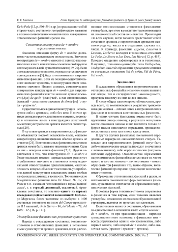 Статья посвящена проблеме создания испанских топонимических фамилий. В ней излагаются результаты исследования, цель которого заключается в выявлении особенностей образования и описании структурных моделей оттопонимных семейных имен. Сравнительно-сопоставительный анализ оттопонимных фамилий с этимоном-топонимом, его словообразовательными типами, а также с патронимическими фамилиями позволили сделать выводы об общих и частных закономерностях образования фамильных имен в испанском языке. К числу общих закономерностей относится трансонимизация онимов - личных имен в патронимических фамилиях и топонимов в оттопонимных фамилиях. Наряду с трансонимизацией в образовании патронимических фамилий задействованы синтаксические и морфологические средства (сочетание личного имени с предлогом de, а также патронимические суффиксы). Образование оттопонимных фамилий базируется исключительно на трансонимизации, действие которой зависит не столько от словообразовательной структуры топонима-этимона, сколько от формально-графической формы его представления. Топонимы-универбы (производные и сложные) становятся фамилиями без каких-либо изменений своей структуры и служат источником омонимии онимов. Непроизводные двусоставные топонимы с определенным артиклем женского рода в результате фузии становятся однословными фамилиями. Составные топонимы, имеющие форму nombre + de + nombre, при переходе в фамильное имя всегда утрачивают один из своих компонентов, либо первый nombre, либо второй de + nombre, либо связочную часть (предлог/ предлог + артикль), в результате возникают две модели - однокомпонентная nombre и двухкомпонентная de + nombre. Фамилии, созданные по однокомпонентной модели, зачастую восходят к разным этимонам - топонимам-универбам и составным топонимам, частью которых является тот же самый топоним-универб. Это является главной причиной многократного превышения топонимов-этимонов по сравнению с оттопонимными фамилиями, тогда как в патронимических фамилиях количество этимонов меньше количества фамилий. При анализе языкового материала применялись сравнительно-сопоставительный и описательный методы, а также метод количественного и лексикографического анализа.