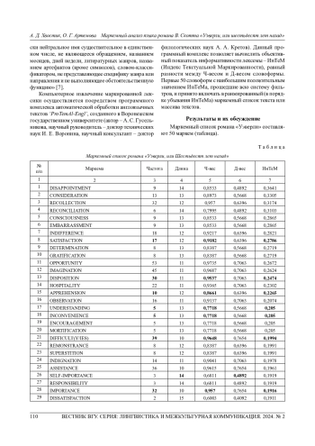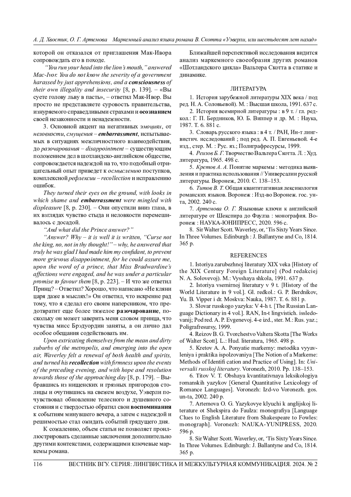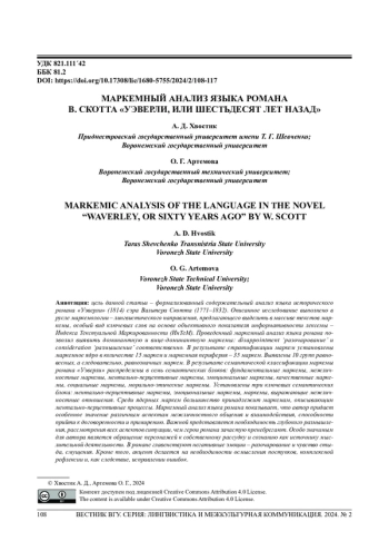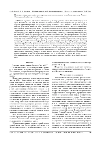 Цель данной статьи - формализованный содержательный анализ языка исторического романа «Уэверли» (1814) сэра Вальтера Скотта (1771-1832). Описанное исследование выполнено в русле маркемологии - лингвистического направления, предлагающего выделить в массиве текстов маркемы, особый вид ключевых слов на основе объективного показателя информативности лексемы -Индекса Текстуальной Маркированности (ИнТеМ). Проведенный маркемный анализ языка романа позволил выявить доминантную и вице-доминантную маркемы: disappointment ‘разочарование ’ и consideration ‘размышление ’ соответственно. В результате стратификации маркем установлены маркемное ядро в количестве 15 маркем и маркемная периферия - 35 маркем. Выявлены 10 групп равновесных, а следовательно, равнозначных маркем. В результате семантической классификации маркемы романа «Уэверли» распределены в семь семантических блоков: фундаментальные маркемы, межличностные маркемы, ментально-перцептивные маркемы, эмоциональные маркемы, качественные маркемы, социальные маркемы, морально-этические маркемы. Установлены три ключевых семантических блока: ментально-перцептивные маркемы, эмоциональные маркемы, маркемы, выражающие межличностные отношения. Среди ядерных маркем большинство принадлежит маркемам, описывающим ментально-перцептивные процессы. Маркемный анализ языка романа показывает, что автор придает особенное значение различным аспектам межличностного общения и взаимодействия, способности прийти к договоренности и примирению. Важной представляется необходимость глубокого размышления, рассмотрения всех аспектов ситуации, чем герои романа зачастую пренебрегают. Особо значимым для автора является обращение персонажей к собственному рассудку и сознанию как источнику мыслительной деятельности. В романе главенствуют негативные эмоции - разочарование и чувство стыда, смущения. Кроме того, акцент делается на необходимости осмысления поступков, комплексной рефлексии и, как следствие, исправлении ошибок.