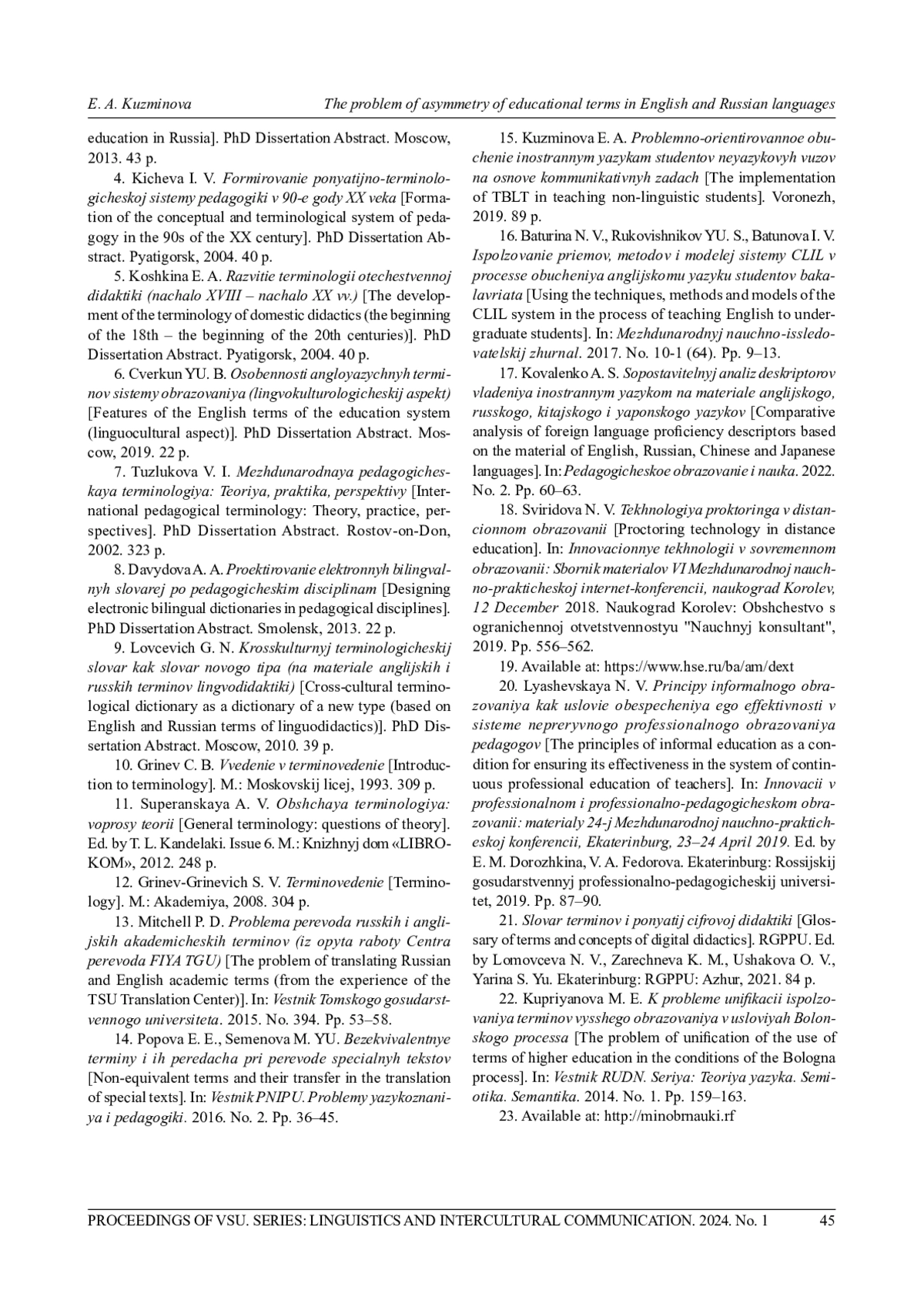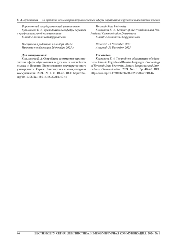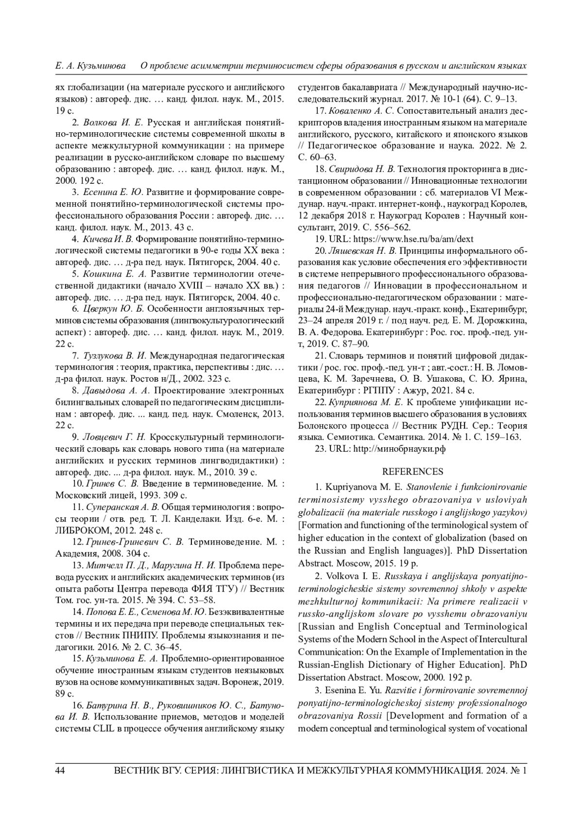 1. Куприянова М. Е. Становление и функционирование терминосистемы высшего образования в условиях глобализации (на материале русского и английского языков): автореф. дис.. канд. филол. наук. М., 2015. 19 с. EDN: ZPPGHB