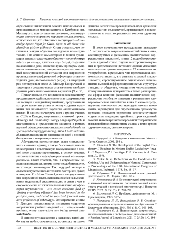 Представленное исследование посвящено рассмотрению тенденции к развитию и повсеместному внедрению инклюзивного языка в качестве механизма расширения словарного состава современного английского языка. Предметом исследования выступают инклюзивные лексические единицы английского языка, широкое распространение которых обусловлено текущей языковой политикой западных стран, направленной на продвижение вербальной толерантности и инклюзивности в отношении представителей меньшинств. Указанные лексические единицы выбраны объектом данной статьи ввиду того, что в настоящее время права и свободы представителей тех или иных меньшинств в большей степени рассматриваются через призму политического дискурса в качестве объекта противостояния демократической и республиканской партий США. Цель исследования заключается в изучении особенностей вышеуказанных лексем и влиянии актуальных социальных тенденций на их возникновение. В качестве источника лексического материала выступили интернет-издания The Tennessean, The New York Times, Fox News, The Indian Express, Daily Mail, Sun Francisco Bay Times, Daily Collegian, а также New York Post. Методы исследования включают семантический и словообразовательный анализ собранного лексического материала с учетом особенностей контекста его употребления. Проведенное исследование позволило убедиться в специфичности природы инклюзивных лексем, и условий, влияющих на их возникновение, а также подтвердить идею о тесной взаимосвязи языка и текущих социальных тенденций. Во-первых, установлено расширение семантического значения лексемы inclusion, в начале ХХ в. используемой в отношении лиц с инвалидностью, а в условиях современного контекста также имеющей такой компонент значения, как «исключение любой дискриминации по отношению к представителям гендерных, этнических и расовых меньшинств». Во-вторых, исследование позволило сопоставить феномен политической корректности с необходимостью создания инклюзивного языка. В-третьих, к некоторым словообразовательным особенностям рассмотренных инклюзивных лексем следует отнести: отсутствие родоопределяющих окончаний либо их замена морфемой х; замена морфемой х отдельных частей лексемы, не имеющей родоопределяющего окончания, с целью провоцирования соответствующих ассоциаций; исключение любых ассоциаций с лексемами man/woman, male/female, mother/father; создание двухкомпонентных научных аналогов
