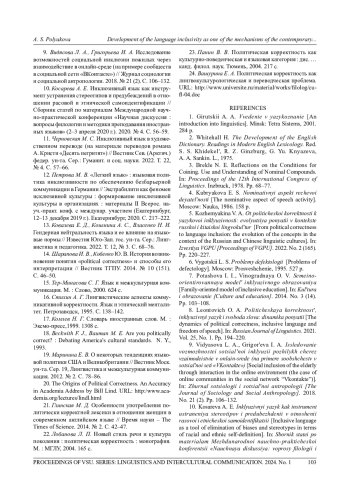 5. Кожемякина В. А. От политической корректности к языковой инклюзивности: эволюция понятий в контексте русской и китайской лингвокультур // Известия ВГПУ 2022. № 2 (165). С. 220-227.