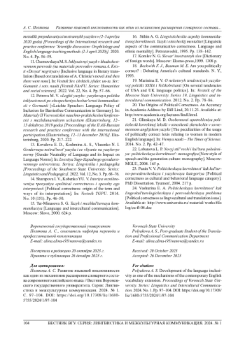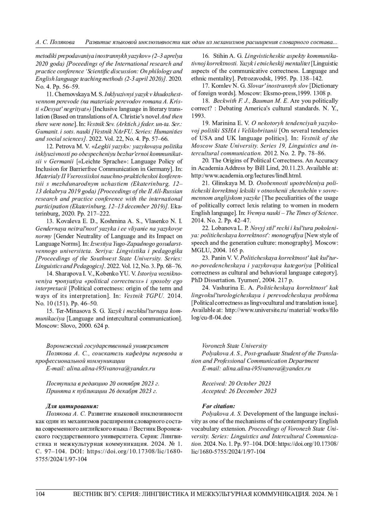8. Леонтович О. А. Политическая корректность, инклюзивный язык и свобода слова: динамика понятий // Russian Journal of Linguistics. 2021. Т. 25, № 1. С. 194220. EDN: KMJJWZ