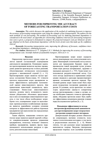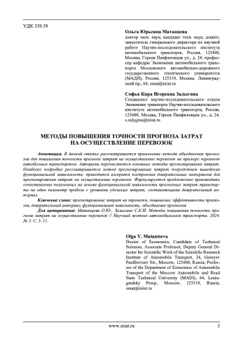 В данной статье рассматривается применение метода объединения прогнозов для повышения точности прогноза затрат на осуществление перевозок на примере перевозок автобусным транспортом. Авторами перечисляются основные методы прогнозирования затрат. Наиболее подробно рассматривается метод прогнозирования затрат посредством выведения функциональной зависимости: приводится алгоритм построения доверительных интервалов для прогнозирования затрат на осуществление перевозок. Формулируется предложение производить сопоставление полученных на основе функциональной зависимости прогнозных затрат транспорта на один километр пробега с уровнями удельных затрат, составляющими доверительный интервал