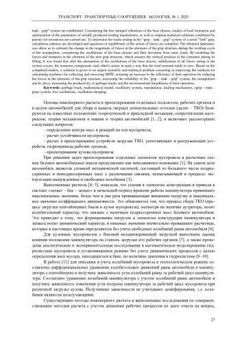 Обоснована актуальность проведения исследования динамического характера рабочих процессов кузовных мусоровозов с учетом свободных колебаний рамы автомобиля. Обобщены результаты исследований влияния конструктивного исполнения манипуляторов кузовных мусоровозов с боковой загрузкой на формирование усилий в конструктивных элементах мусоровоза при взаимодействии их с нагрузкой, создаваемой весом контейнера при выполнении рабочих операций: подъем, опрокидывание, опускание. Составлена модель и приведена расчетная схема мусоровоза как колебательной системы. Определен характер колебаний рамы мусоровоза в рабочем режиме. Установлены закономерности формирования усилий в системе «захват - бак - захват». С учетом свободных затухающих колебаний базового шасси выполнены исследования формирования нагрузок и оптимизация параметров серийно выпускаемых механизмов загрузки, а также оригинальных технических решений, подтвержденных патентами на изобретения. Для определения нагрузок, возникающих в системе «захват - бак - захват» серийного «вилочного» захвата, разработаны расчетные схемы и составлены уравнения равновесия действия сил. Полученные зависимости позволяют оценить изменение величины усилий в элементах конструкции захвата за рабочий цикл работы манипулятора с учетом колебаний базового шасси и их отклонение от статических нагрузок. Моделированием сил и моментов в элементах новой конструкции захвата, обеспечивающей вертикальное положение контейнера в процессе его подъема, установлено, что после затухания колебаний базового шасси происходит стабилизация всех сил, действующих в системе, моменты компенсируют действие друг друга таким образом, что суммарный момент стремится к нулю. На основании выполненных исследований дано решение актуальной научно-технической задачи, состоящей в совершенствовании методов расчета машин для сбора и вывоза твердых коммунальных отходов, обеспечивающих повышение эффективности их эксплуатации за счет снижения усилий в элементах конструкции захвата, повышения надежности системы «захват - бак - захват» манипулятора и его привода, повышения производительности мусоровозов и экологичности их работы.