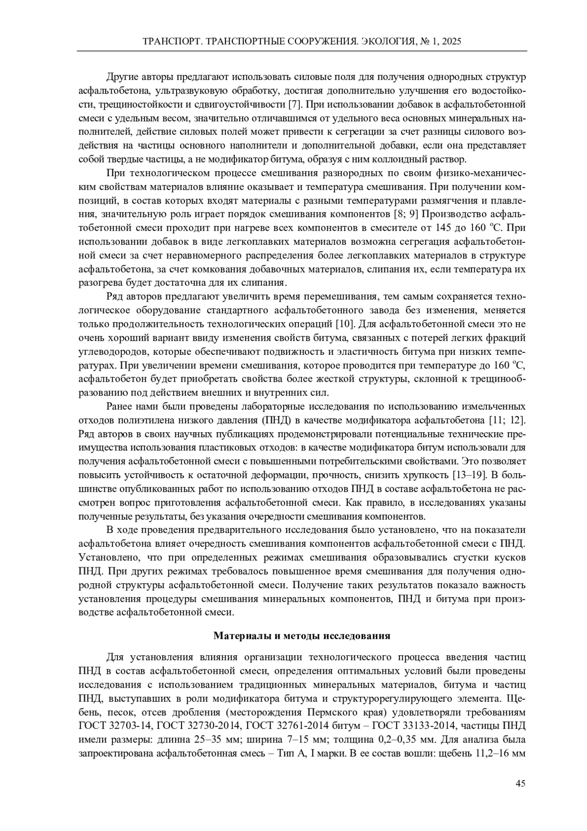 Асфальтобетоны представляют собой композиционный материал, состоящий из минеральных материалов различного гранулометрического состава и битума. Для регулирования физико-механических и эксплуатационных показателей асфальтобетонов в состав асфальтобетонной смеси вводят дополнительные компоненты. Использование в составе асфальтобетонов различных добавок требует уточнения классической схемы производства асфальтобетонной смеси, определения последовательности введения добавки и технологических режимов ее производства. В большинстве опубликованных работ по использованию структурорегулирующих добавок в составе асфальтобетона не рассматриваются вопросы технологии производства асфальтобетонной смеси. Как правило, в исследованиях указаны полученные результаты без упоминания технологических режимов, в том числе очередности смешивания компонентов. На примере использования измельченных отходов полиэтилена низкого давления в качестве структурорегулирующей добавки проведено исследование по установлению характера влияния на физико-механические показатели асфальтобетонов процесса смешивания. Анализ полученных показателей асфальтобетонных образцов с частицами полиэтилена низкого давления и вычисленные коэффициенты вариации и осцилляции показали, что на качество асфальтобетонной смеси процесс смешивания оказывает значительное влияние. Установлено, что физико-механические показатели образцов асфальтобетона могут варьироваться в пределах 6-15 %, что указывает на формирование существенной неоднородности асфальтобетонной смеси и, как следствие, асфальтобетон будет иметь значительную неоднородность своей структуры при промышленном выпуске. Установлено, что для обеспечения высокой степени композиционной однородности структуры асфальтобетона при использовании в его составе измельченного полиэтилена низкого давления необходимо его вводить в состав асфальтобетонной смеси на этапе смешивания каменных материалов. Битум добавляется в смесь после перемешивания каменных материалов с частицами полиэтилена низкого давления. Такой порядок смешивания обеспечивает минимальное время приготовления асфальтобетонной смеси, снижение потребления энергетических ресурсов, обеспечение эффективности технологии утилизации тары из полиэтилена низкого давления. На примере использования полиэтилена низкого давления в качестве структурорегулируюшей добавки показано влияние процесса смешивания в технологии производства асфальтобетонных смесей на физико-механические свойства асфальтобетона.