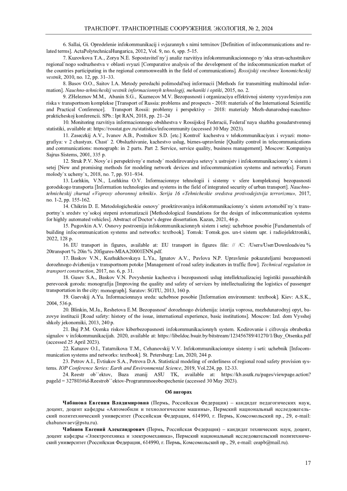 1. Абанин, С.Г. Обеспечение безопасности и организация эффективной системы выявления зон риска в транспортном комплексе / С.Г. Абанин, М.М. Железнов, М.В. Кузнецов // Транспорт России: проблемы и перспективы - 2018: материалы международной научно-практической конференции. 13-14 ноября 2018 г. СПб.: ИПТ РАН. - СПб., 2018. - Т. 2. - С. 21-24. EDN: HMBVDT