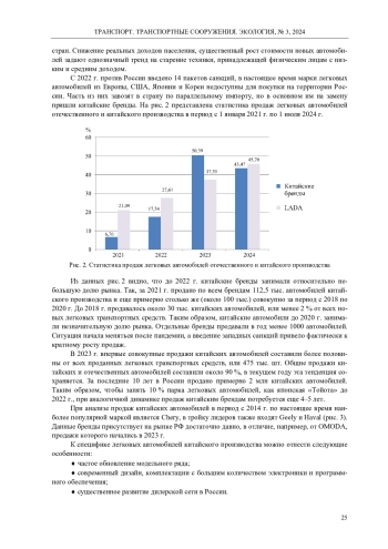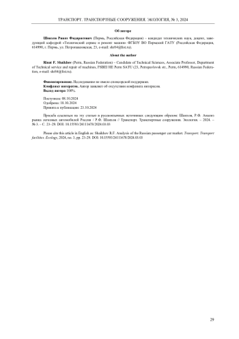 Транспорт играет важную роль как для государства, так и для отдельно взятой семьи. Санкционная политика западных стран оказала существенное влияние на структуру и состав парка легковых автомобилей России. За последние два года страну покинули 46 брендов, усложнилась логистика снабжения запасными частями, увеличились цены. В статье представлен анализ рынка легковых автомобилей в России в период с 2022 г. по настоящее время. В качестве материалов исследования использовались официальные данные автомобильной статистики за указанный период. Проанализирована динамика изменения численности автомобилей в России, а также их состав и средний возраст, изменение структуры продаж новых транспортных средств в сторону увеличения количества китайских автомобилей. Исследована статистика продаж китайских автомобилей по маркам, а также определена их специфика. К основным плюсам китайских производителей можно отнести современный дизайн продукции, широкий ассортиментный ряд, наличие электроники и дополнительных функций, а также развитие дилерской сети в России. Ключевыми недостатками являются сложность поиска запасных частей на непопулярные марки и на автомобили снятые с производства. Также различное программное обеспечение и полное или частичное отсутствие технической документации на техническое обслуживание, ремонт и диагностику транспортных средств. Представлен анализ выхода китайских производителей на российский рынок, проанализированы преимущества и недостатки. Основным подходом для новых брендов остаются продажи через посредников, без официального представительства. В результате исследования установлена динамика изменения парка легковых автомобилей в России, а также специфика развития после введения санкций от западных стран.
