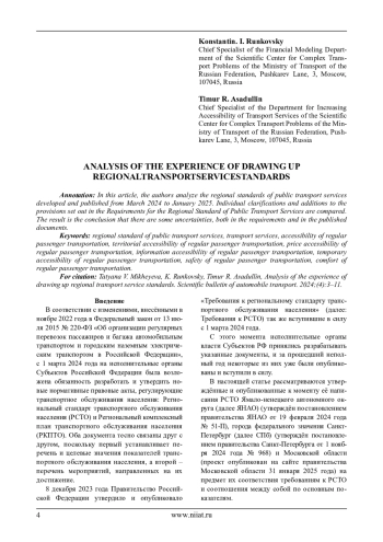 В этой статье авторами анализируются региональные стандарты транспортного обслуживания населения, разработанные и опубликованные с марта 2024 по январь 2025 года. Сравниваются индивидуальные уточнения и дополнения к положениям, изложенным в Требованиях к Региональному стандарту транспортного обслуживания населения. Итогом является вывод о наличии некоторых неопределенностей, как в требованиях, так и в опубликованных документах.